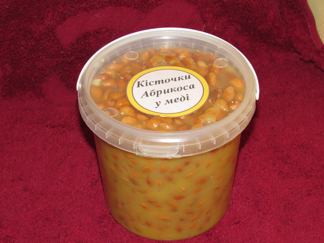 1 л відерці: 500 грам ядер кісточки абрикоса, 500 мл мед соняшниковий - ціна 165 грн